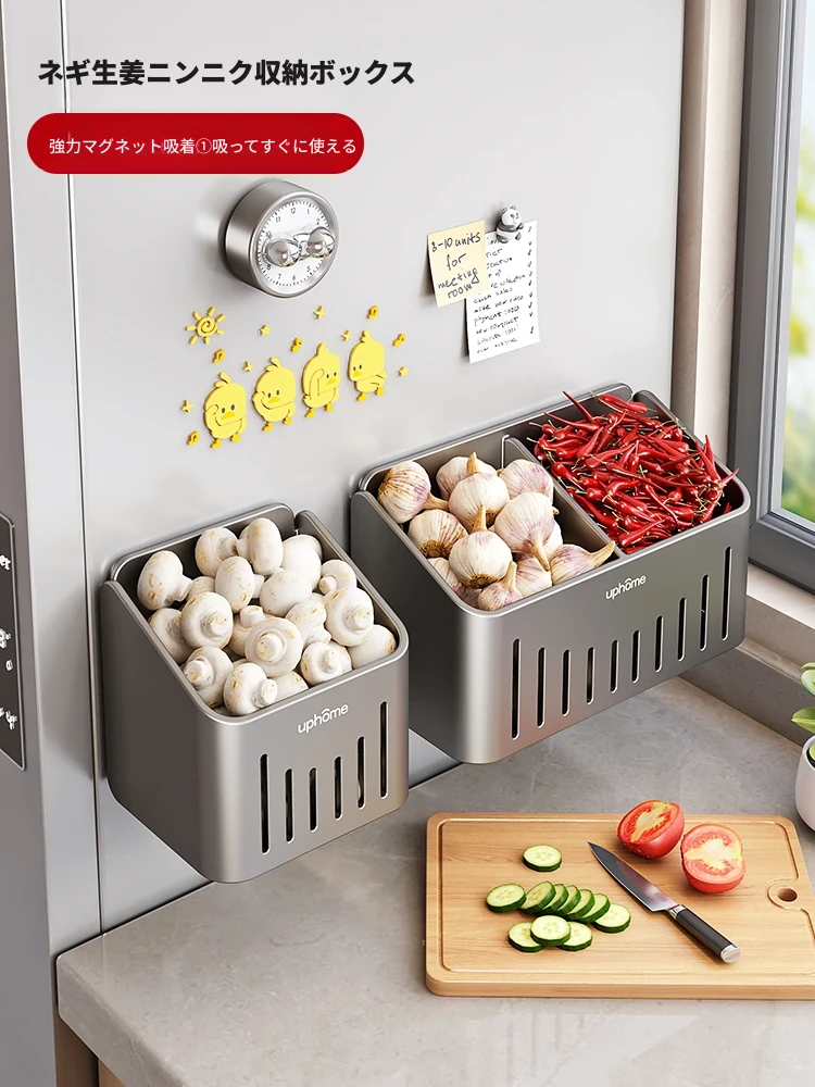 キッチン磁石付きネギ生姜ニンニク収納ボックス - 生姜やニンニクをすっきり整理!冷蔵庫の外側に取り付けるだけで、スペースを有効活用。多機能壁掛け調味料バスケットで、料理をもっと便利に!